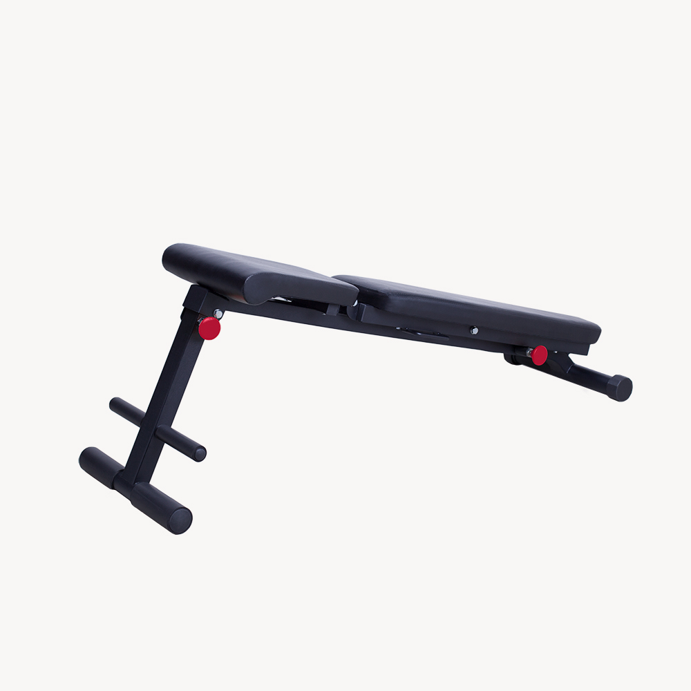 Zwei 5 cm hohe Polster bilden die Liegefläche, die straff mit hochwertigem Kunstleder bespannt ist. Aus diesem Grund bekommt das Leder auch nach jahrelanger Nutzung keine lästigen „Wellen“. Wer sich im Bereich der faltbaren Hantelbänke ein wenig auskennt, der weiß, dass die Liegefläche mit 122 cm ausreichend lang ist. Die Trainingshöhe der Bank beträgt optimale 43 cm und das etwas schräge Sitzteil ist perfekt um alle Übungen bequem ausführen zu können.